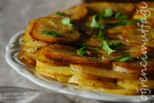 Patatesleri soyup orta kalınlıkta dilimleyelim. Sıvıyağ, tuz ve baharat ekleyip karıştıralım. Isıya dayanıklı fırın kabına fırın kağıdı serip patatesli sıra sıra dizelim. Kabın üzerini alüminyum folyo ile kapatarak fırına sürelim. 40 dk kadar 170 derecede pişirdikten sonra folyoyu çıkaralım bir kaç dakika daha pişirelim. Patateslerin pişip pişmediğini kontrol ettikten sonra fırından alarak kabı servis tabağına ters çevirelim. Üzerini maydanoz la süsleyip sıcak servis yapabilirsiniz.